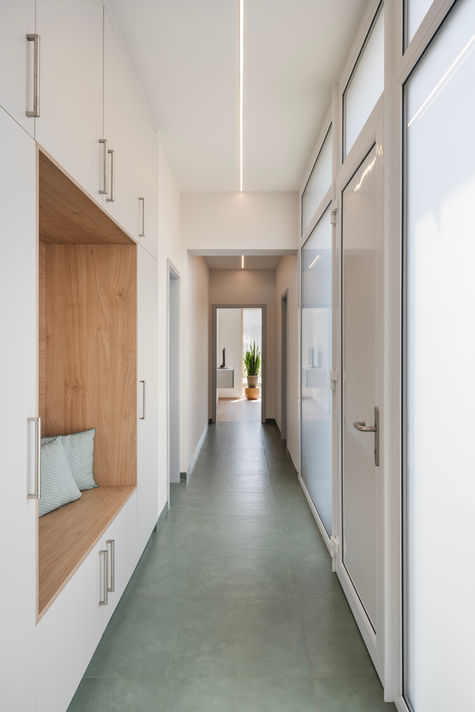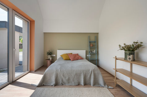 A hátsó, eltérő színű terrakotta tömeg bizonyos nézőpontokból kikacsint szürkébb társa háta mögül, jelezve: ő is itt van, mely egy kedves és elsőre nem evidens jelenlét, és ami finoman de határozottan jellemzi az így létrejött épület személyiségét.